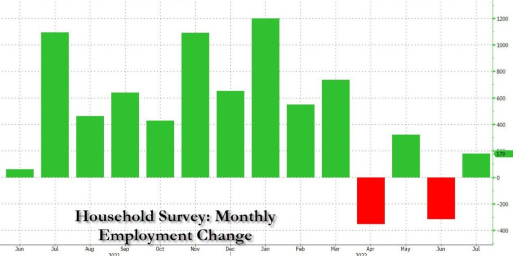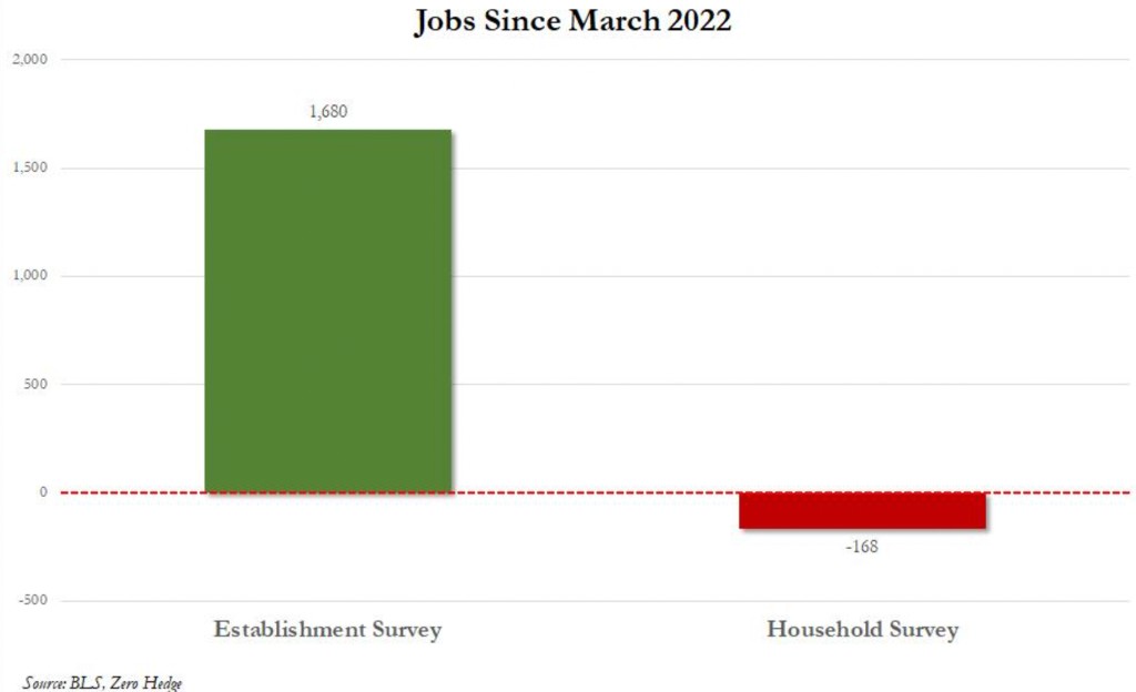 事實上,自 3 月份以來,機構調查顯示就業人數新增了 168 萬人,而家庭調查顯示減少了 16.8 萬人。