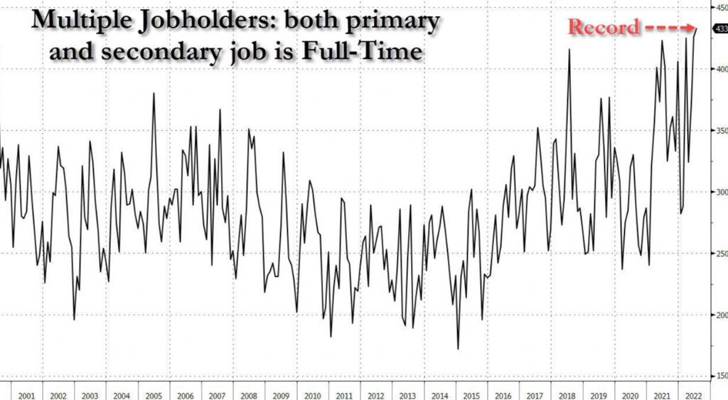 更值得一提的是,其中初級和中級工作的多份工作者人數創下歷史新高,這並不是一個強勁的就業市場的特徵,在這個市場上,人們可以隨意辭職。工作的人越來越少,但從事一份以上工作的人卻越來越多。