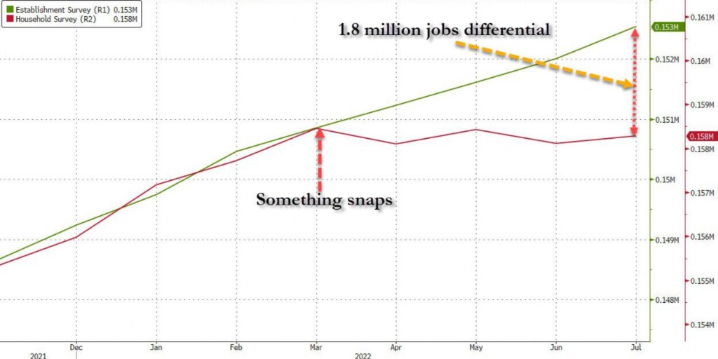 分析指出,由於機構調查在發現就業構成的細微差別方面要慢得多,而家庭調查自 3 月份以來一直停滯不前,在白宮的推動下(尤其是現在經濟處於技術衰退之中),使其看起來好像經濟正在強勁增長,而事實上,他們所做的只是應用了錯誤的季節性調整因素。