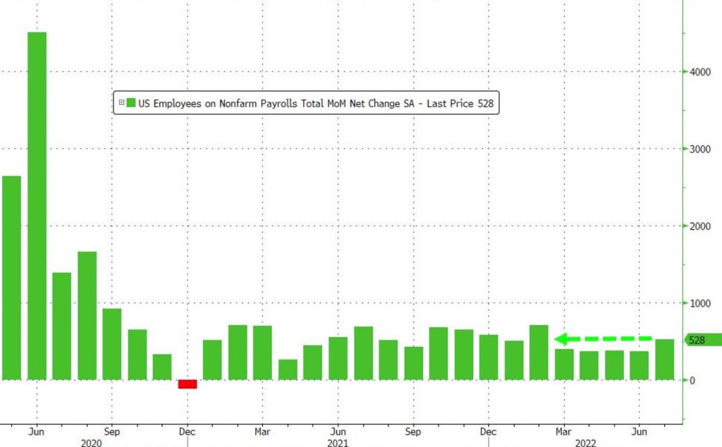 首次,機構調查的新增就業人數異常火爆,不僅在美國上週進入 “技術性衰退” 的情況下大幅飆升,而且達到了 5 個月來的最高點 52.8 萬人,比普遍預期的 25 萬翻了一番。工資漲幅也比預期的更高,使得許多人認為,經濟衰退的呼聲還為時過早。