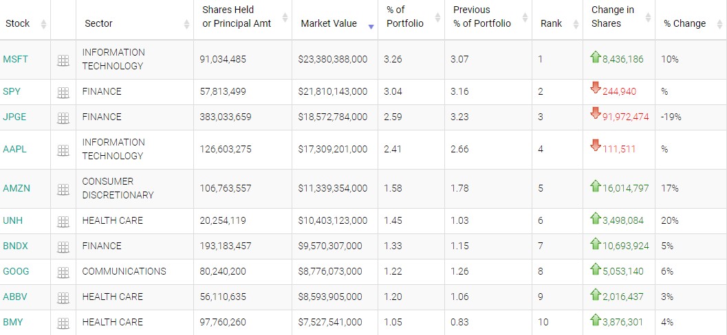 在前五大重倉股中,上季度位列第三的微軟 (MSFT.US) Q2 位列第一,持倉約 9103 萬股,持倉市值約為 234 億美元,佔投資組合比例為 3.26%,並且持倉數量較上季度增持 10%。