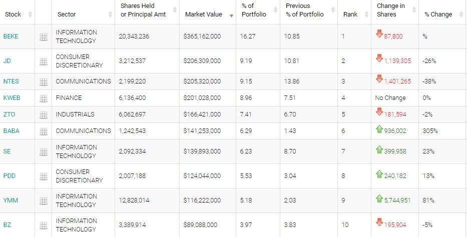 KraneShares 中國海外互聯網 ETF(KWEB.US)、中通快遞 (ZTO.US) 分別位列第四和第五,持倉市值分別為 2.01 億美元、1.66 億美元。