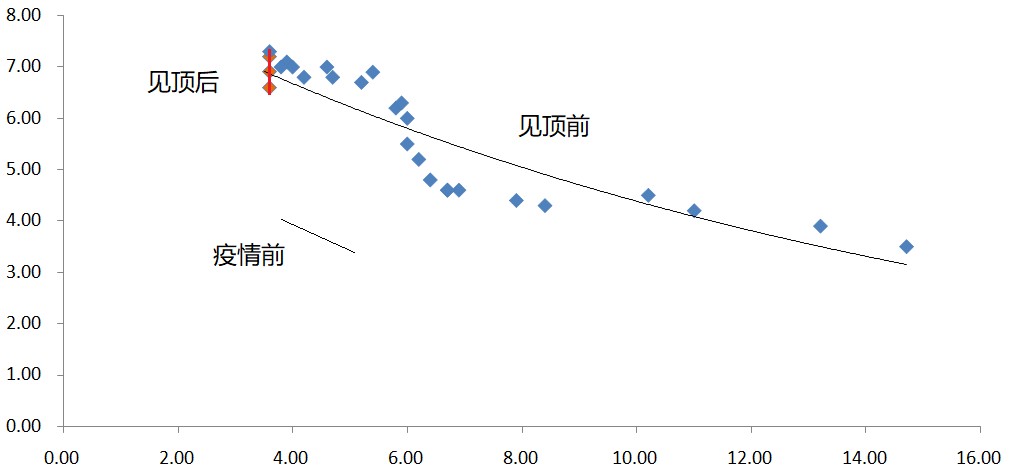 我們在前期分析中提到,本輪美聯儲的加息將止步於就業市場的冷卻。因此一旦貝弗裏奇曲線開始走平,尤其是接近凹型曲線拐點即平均 V/U 率,或將成為美聯儲承認 “硬着陸” 的信號。
