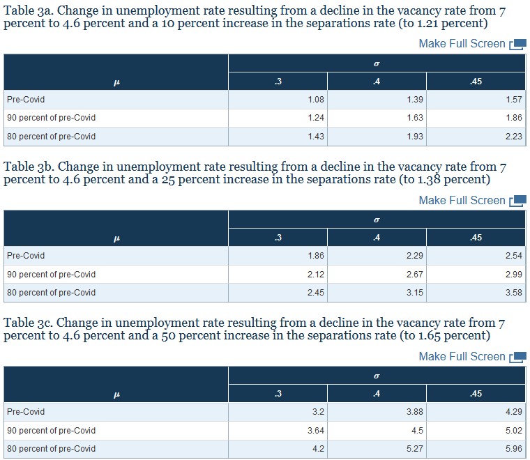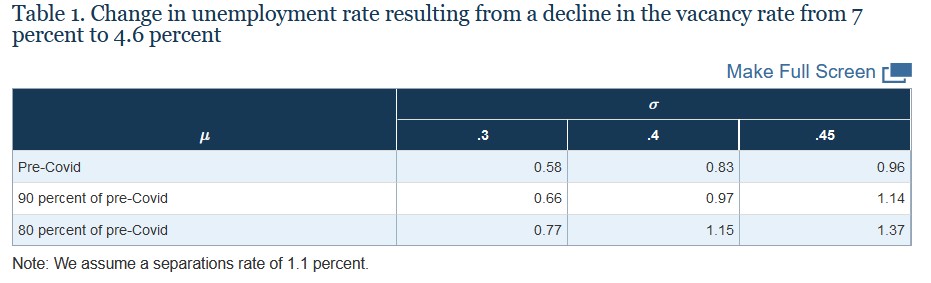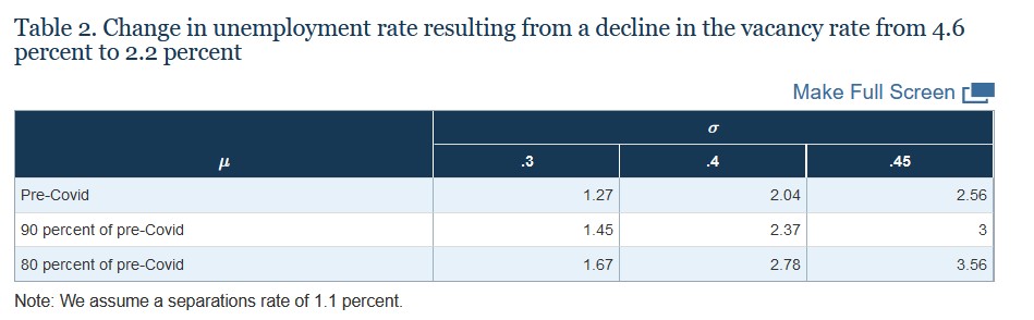 沃勒還將其與空缺率從 4.6% 下降至 2.2% 時的失業率(表 2)變化進行了比較。結果顯示後者失業率的增幅要大的多。