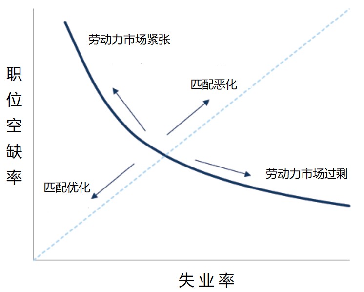 1、如果失業率與職位空缺的匹配過程的效率降低,那麼曲線就會向外移動。因為在同樣水平的職位空缺率下,表現出更高的失業率。或者説在同樣的失業率水平上,職位空缺率更高。如果失業率與職位空缺的匹配的過程效率提升,那麼曲線就會向內移動。