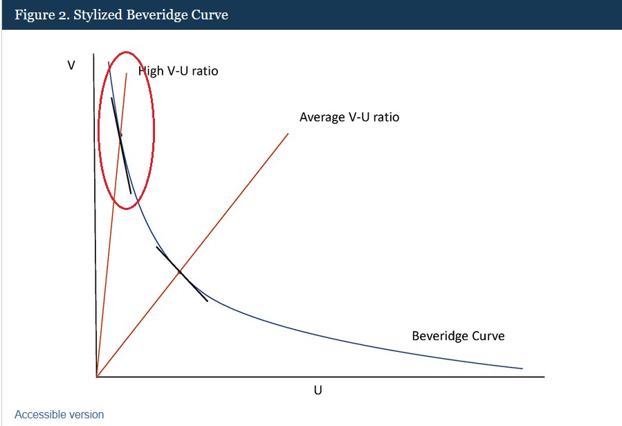 1、貝弗裏奇曲線的斜率:目前職位空缺(V)和失業比率(U)處於歷史高位,也就是説勞動力市場處於貝弗裏奇曲線非常陡峭的部分。陡峭的曲線意味着對於給定的空缺減少,失業率將變化較小。