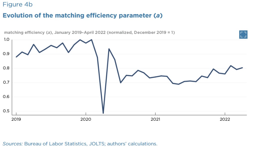 於是,貝弗裏奇曲線在 2020 年春季之後顯著上行,表明匹配效率大幅下降,隨着勞動力市場出現歷史性的緊張狀態,經濟又沿着曲線上升。