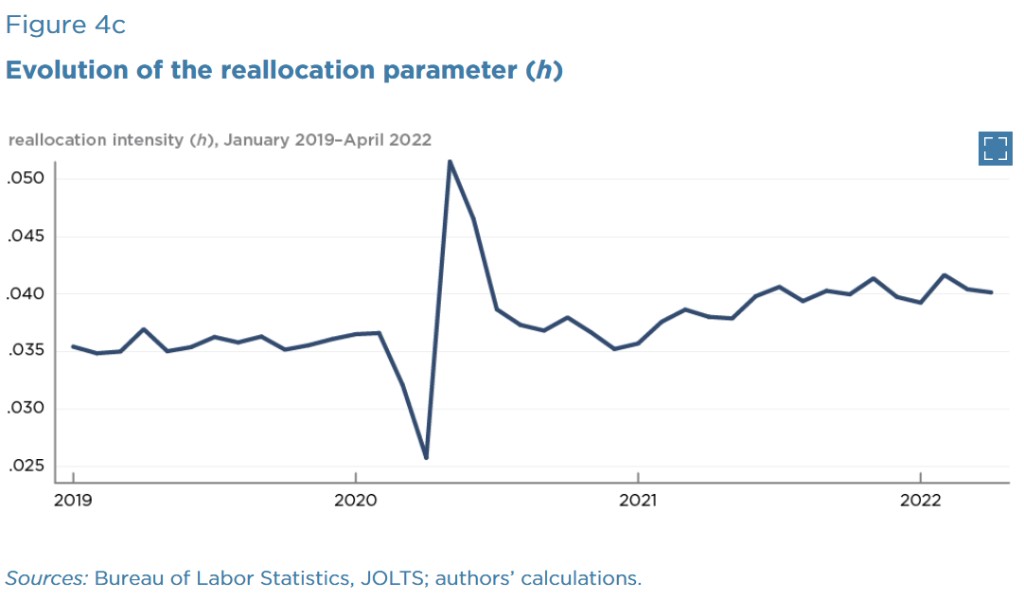 圖 4c 顯示,撇開疫情時的急劇下降和復甦,與 2019 年的平均水平 0.36 相比,再分配已經穩定在更高的水平 0.40。再分配效應我們可以理解為摩擦性失業,它當然會推高自然失業率水平。