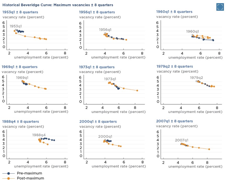 實證研究表明,在美國曆史中不存在職位空缺率顯著下降同時失業率未顯著增加的時期,換句話説,空缺率的下降,都將伴隨失業率大幅增加。