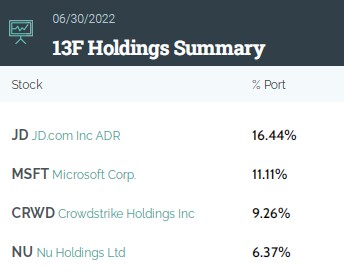 老虎環球基金在第二季度減持京東 1825 萬股,持倉市值降至 19.6 億美元,但仍為其第一重倉股,減持 29.5% 的微軟持倉至 516 萬股,為其第二重倉股,減持 25% 的 Crowdstrike 持倉至 655 萬股,為其第三重倉股。