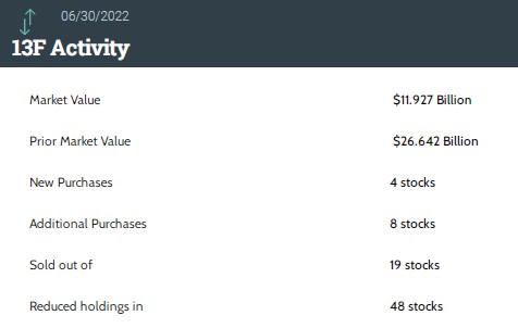 文件顯示,老虎環球第二季度持倉總市值為 119.27 億美元,環比下降約 55%,相比於 2021 年底的 460 億美元萎縮超過 70%。據統計,老虎環球在二季度減持了 48 只個股,清倉了 19 只個股,僅建倉了 4 只個股,增持了 8 只個股。其中前十大持倉標的佔總市值的 67.45%。