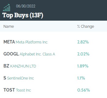 在減持的同時,老虎環球在二季度繼續增持 Meta,持倉數量升至 449 萬股,佔投資組合比例為 6.07%;新建倉谷歌母公司 Alphabet 221 萬股,佔其投資組合比例 2.02%。另外,老虎環球大手筆增持 BOSS 直聘和網絡安全公司 SentinelOne,增持幅度均超過 60%。