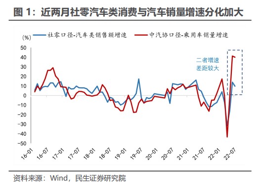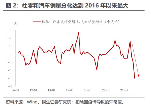 但是我們發現,近期汽車類零售增速顯著低於汽車銷量增速,兩者增速之差達到 2016 年以來最大。