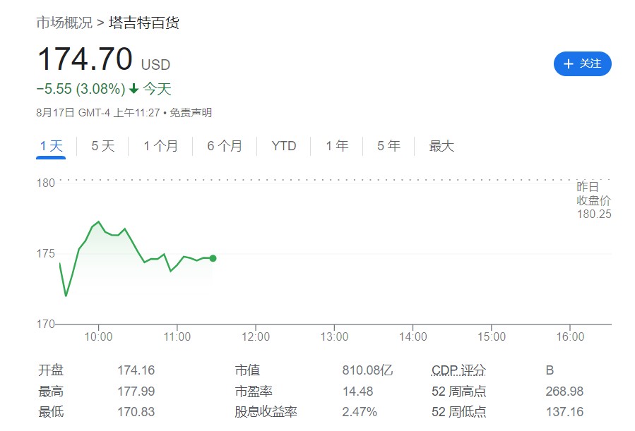 8 月 17 日週三美股盤前,美國第二大零售商塔吉特公佈第二季度業績。財報顯示,塔吉特二季度營收為 260.37 億美元,同比增長 3.5%,略低於市場預期;淨利潤為 1.83 億美元,同比暴跌 89.9%;攤薄後每股收益為 39 美分,不及市場預期的 72 美分;上年同期為 3.65 美元。