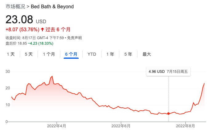 而最近一個月,BBBY 狂漲了 365%。上週一,BBBY 盤中曾漲超 60%;8 月 16 日週二盤中漲近 80%,股價躍升至每股 27 美元以上。