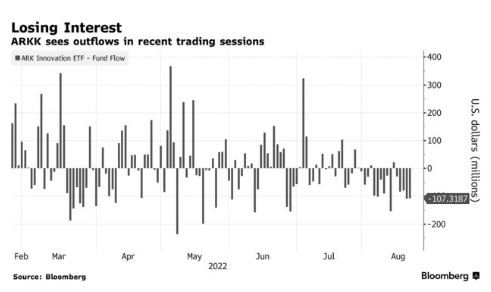 木頭姐的 ARKK 已連續五個交易日出現資金流出,包括過去 12 個交易日中的 11 個交易日。今年迄今為止,除了 6 月份,這隻 ETF 每個月都有資金流入,儘管自 2022 年開始以來,它的市值已經累計下跌近一半,該基金於本週一大跌 2.4%。