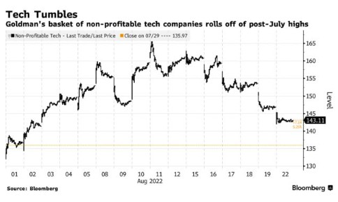 高盛一籃子非盈利科技公司股票於週一下跌 2.6%,目前處於 8 月 2 日以來的最低水平。當投資者預計利率上升和通脹會侵蝕未來收益時,那些基於未來利潤預期而估值極高的科技公司股價就會面臨下跌風險。