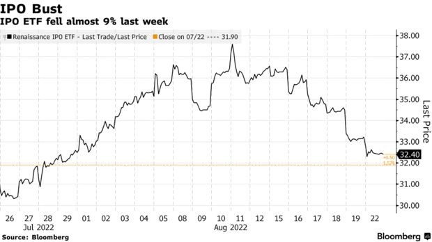 美聯儲激進的貨幣政策對新上市公司的打擊尤為嚴重。Renaissance IPO ETF (IPO) 上週下跌 8.9%,創 5 月份以來最大單週跌幅。自今年年初以來,該基金已經累計下跌了約 44%。