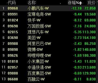個股方面,小鵬汽車收跌超 12%,股價收跌至 72.85 港元,盤中股價一度跌超 14% 創上市以來新低。