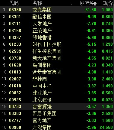 房地產板塊走低,龍光集團跌超 51%,融信中國跌超 9%,正榮地產跌超 6%,時代中國控股跌超 5%。