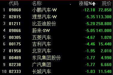 小鵬汽車跌超 12%,蔚來、理想汽車、比亞迪股份跌超 5%,五菱汽車跌近 5%,吉利汽車跌超 4%。