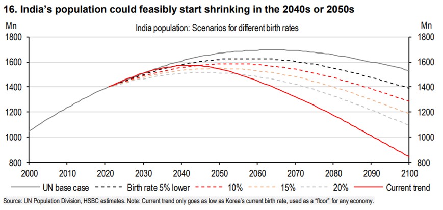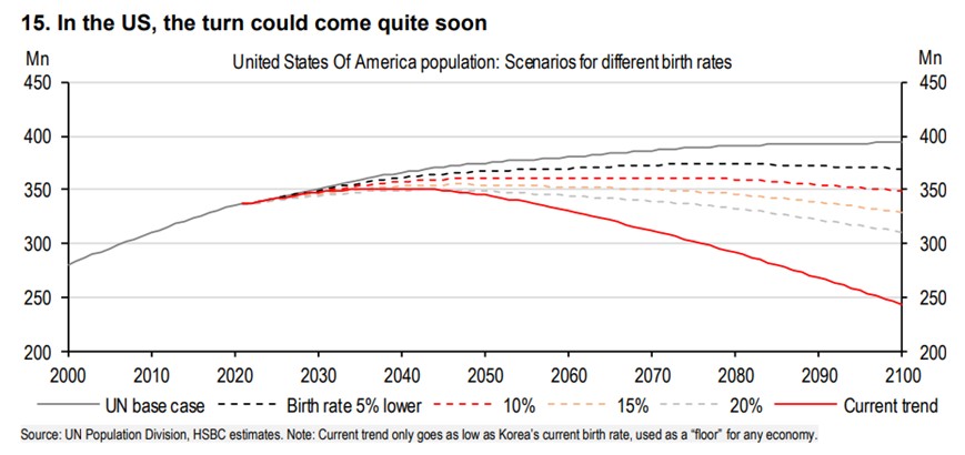 考慮最新的生育率數據等因素,滙豐現在基本預計見頂將在 40 年代末到來(上次預測為 50 年代)。