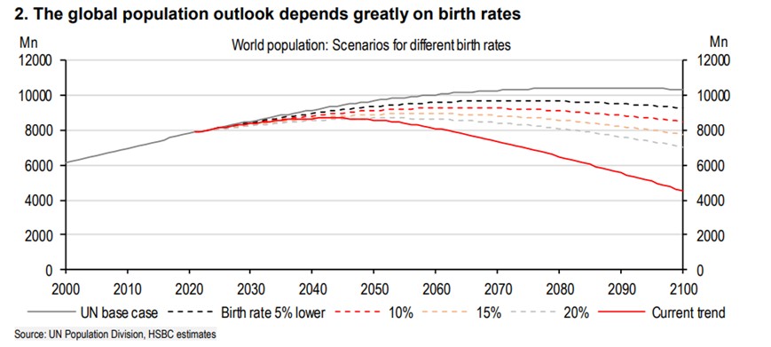 滙豐表示,在最糟糕的情況下,即全球出生率繼續以目前的軌跡下滑,全球人口到 2043 年即可見頂,峯值略高於 80 億,而到 2050 年,全球的人口將比聯合國的基本假設少 10% 以上。