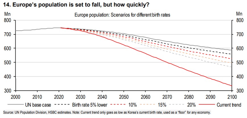 歐洲同樣在人口減少的路上越走越遠。歐洲目前的生育率約為 1.5,近年來一直在低位徘徊。據滙豐計算,在最糟糕的情況下,即將韓國生育率作為 “地板” 生育率,歐洲人口到本世紀末將比當前水平減少 4 億;即使按照聯合國假設的生育率(樂觀預測),到 2050 年,歐洲人口仍將減少 5000 萬以上。