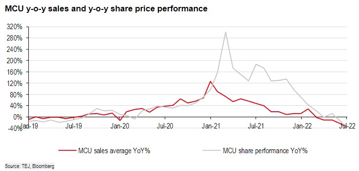 該行發現,如今在微控制器(MCU)等幾個產品類別中,台灣無晶圓廠銷售額不僅開始出現同比下降,甚至開始出現負值。該行認為,那麼這就意味着,整個台灣芯片行業的修正回調才剛剛開始。