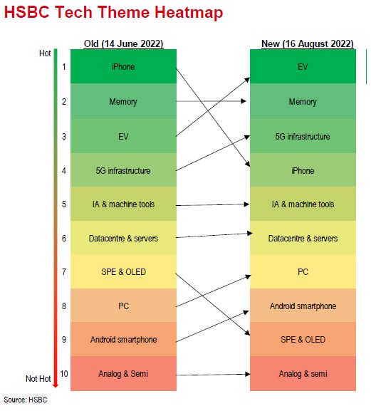 - 安卓智能手機的需求繼續低於預期。該行預計,2022 年全球智能手機出貨量將同比下降 8%。考慮到下半年智能手機需求的整體前景仍然疲弱,該行的悲觀預測認為,今年全球手機出貨量預計將同比下滑 12%-19%。