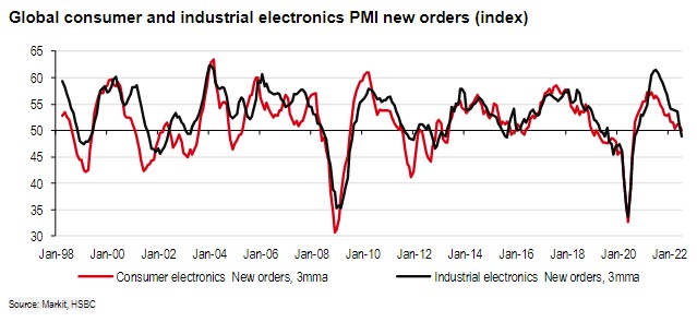 以宏觀角度看,Lee 團隊表示, 滙豐 7 月份的宏觀指標顯示,全球電子產品新訂單出現急劇下滑,新電子產品、消費電子和工業新訂單的需求都在下降。其中,7 月份的工業需求尤為疲弱。