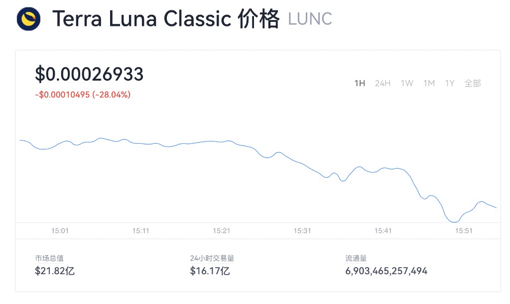 虛擬幣交易平台 OKEX 報價顯示,截至目前,LUNA 日內跌幅超 28%。
