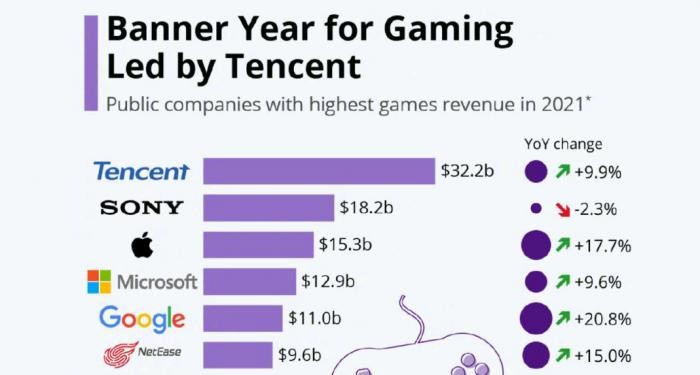 在全球市場,Statista 數據顯示,2021 年,騰訊遊戲收入為 322 億美元(約合人民幣 2248 億元),超過索尼、蘋果。據 IT 桔子,騰訊遊戲市佔率高達 16.7%。