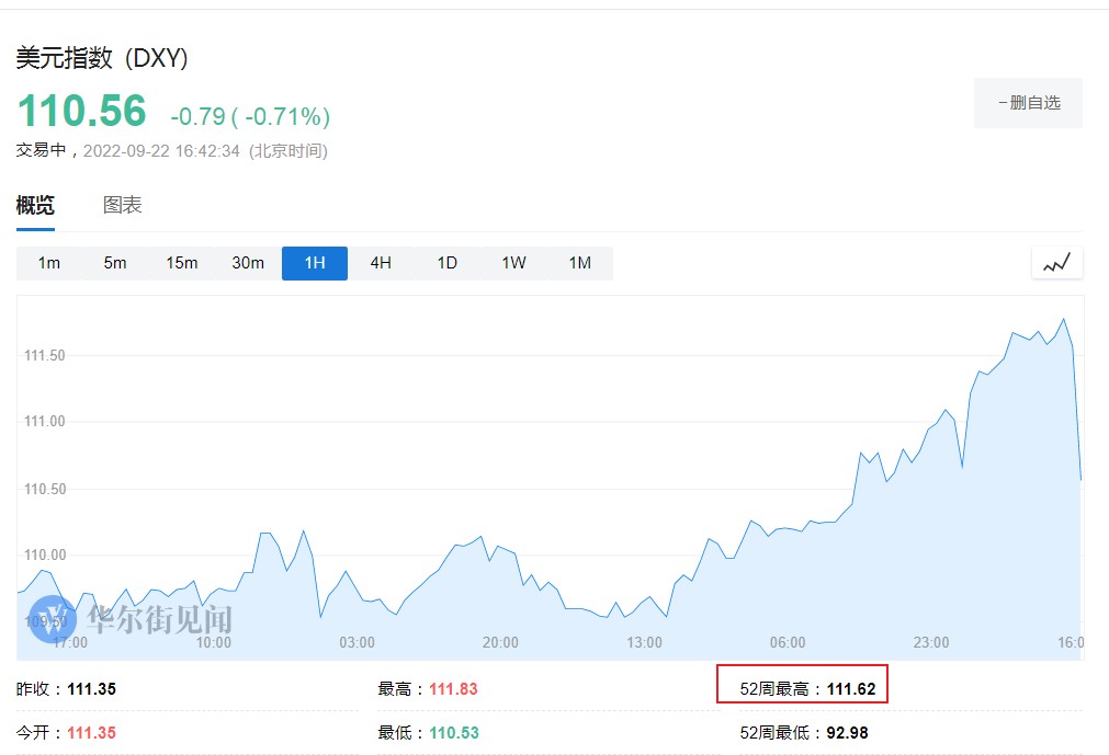 在美联储的连续激进加息下,美元大幅升值,在隔夜议息决议出炉后,美元指数最高冲至 111.83,续创 2002 年以来新高。