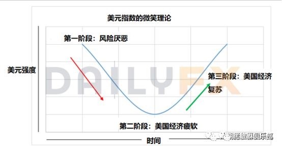 当前,全球周期正处于 “美元微笑” 曲线的第一个阶段,全球经济放缓导致投资者风险偏好减弱,纷纷涌入美元避险,美元开始走强。