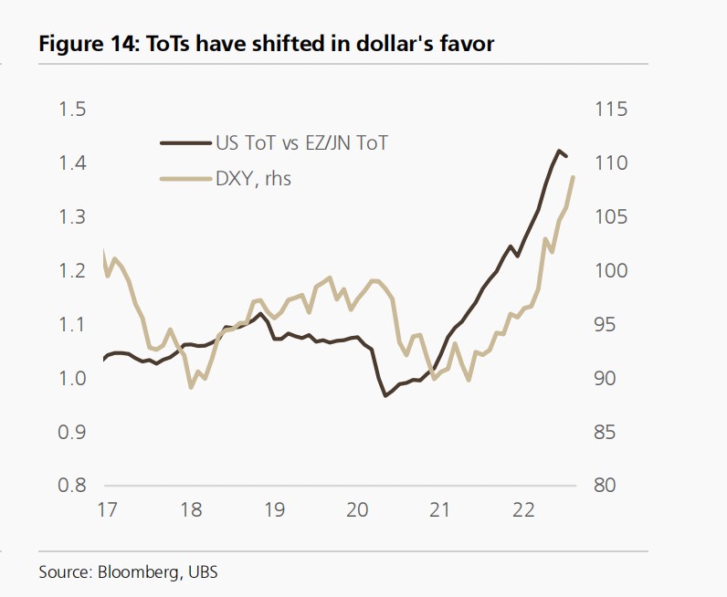 所以,瑞银认为,当前强势美元的更有力解释是全球经济增长下滑(“美元微笑” 理论)和美国相对于 G10 的贸易条件大幅改善。