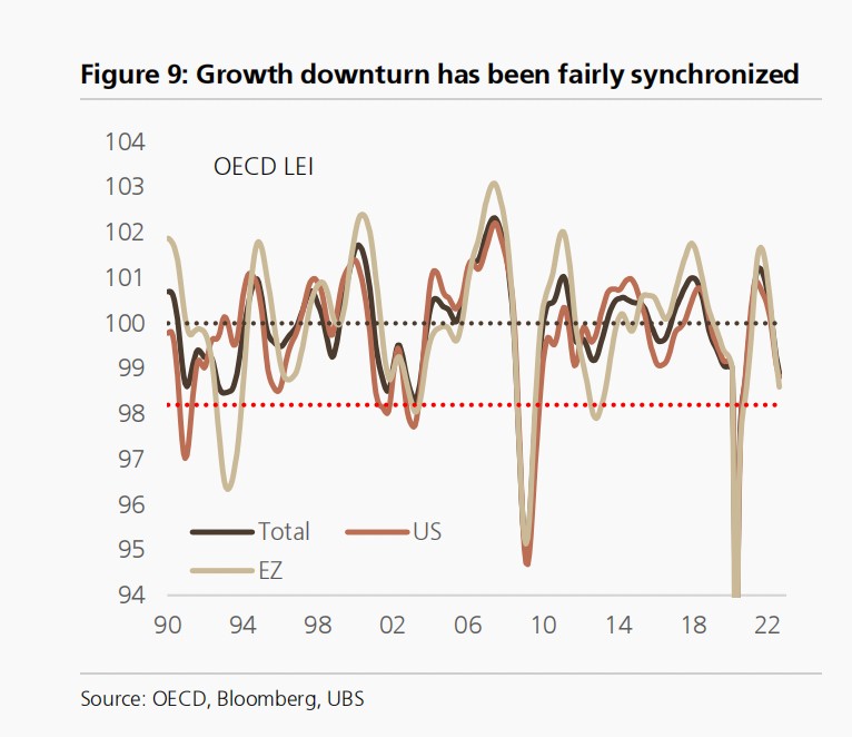 虽然美元走强在一定程度上受益于美联储鹰派加息,但瑞银认为这可能不是最根本的因素,根据经合组织领先指标,全球周期已经相当同步,全球主要央行基本都走上了货币政策正常化的道路。