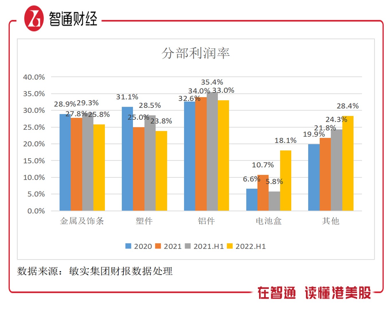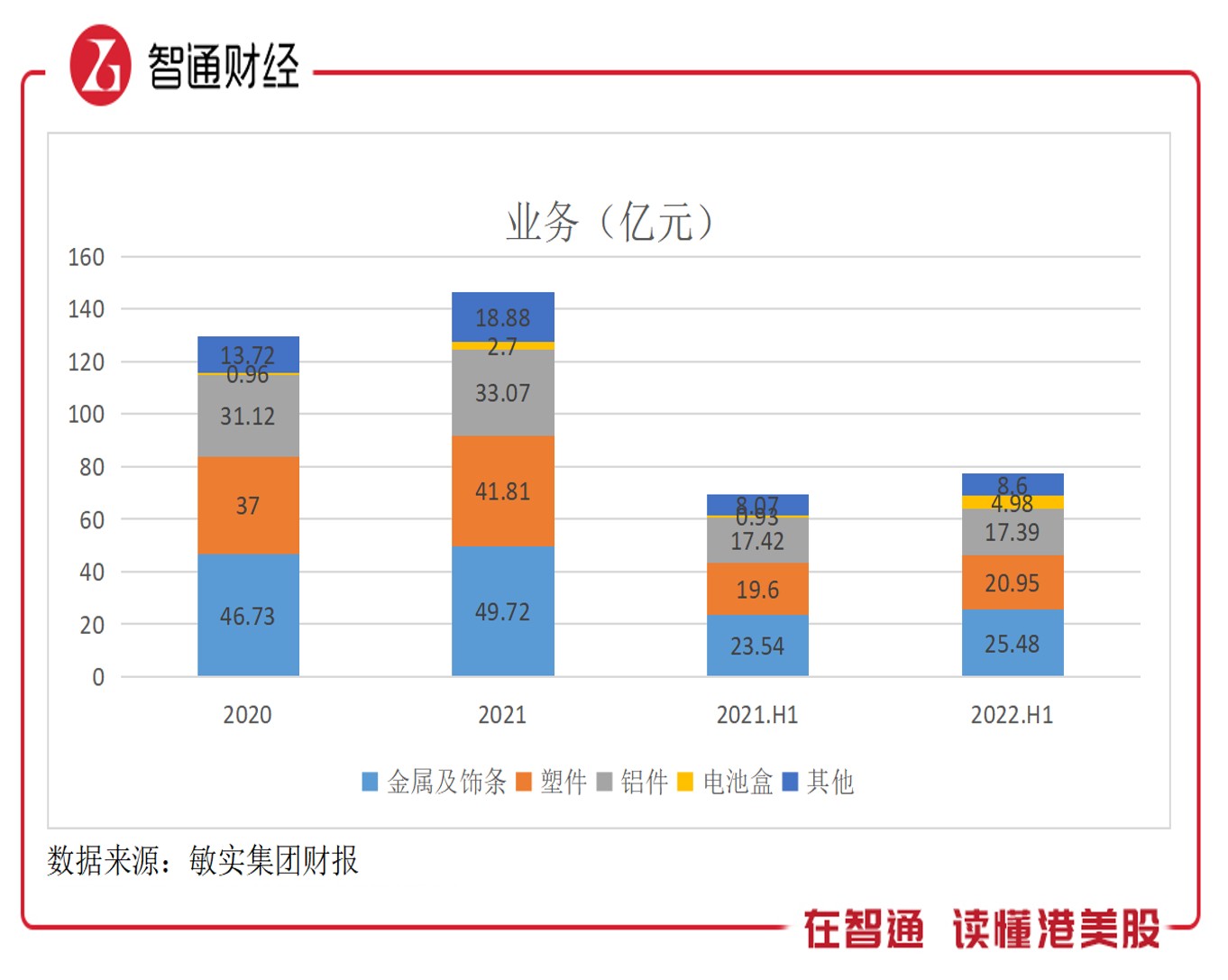 智通財經 APP 瞭解到,敏實集團主要從事汽車零部件和工裝模具業務,汽車零部件業務主要包括金屬及飾條、塑件、鋁件和鋁電池盒產品,在分錄中均單獨列示,而工裝模具業務包括汽車外飾件及車身結構件在開發等各類模具與夾具,歸入其他業務。該公司屬於汽車產業鏈上游,業績緊跟下游需求環境變化。