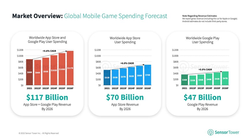 Sensor Tower 預計,全球手遊市場營收將在 2023 年重回增長軌跡,到 2026 年將上升至 1170 億美元,未來幾年內的年均複合增長率約為 5.6%。