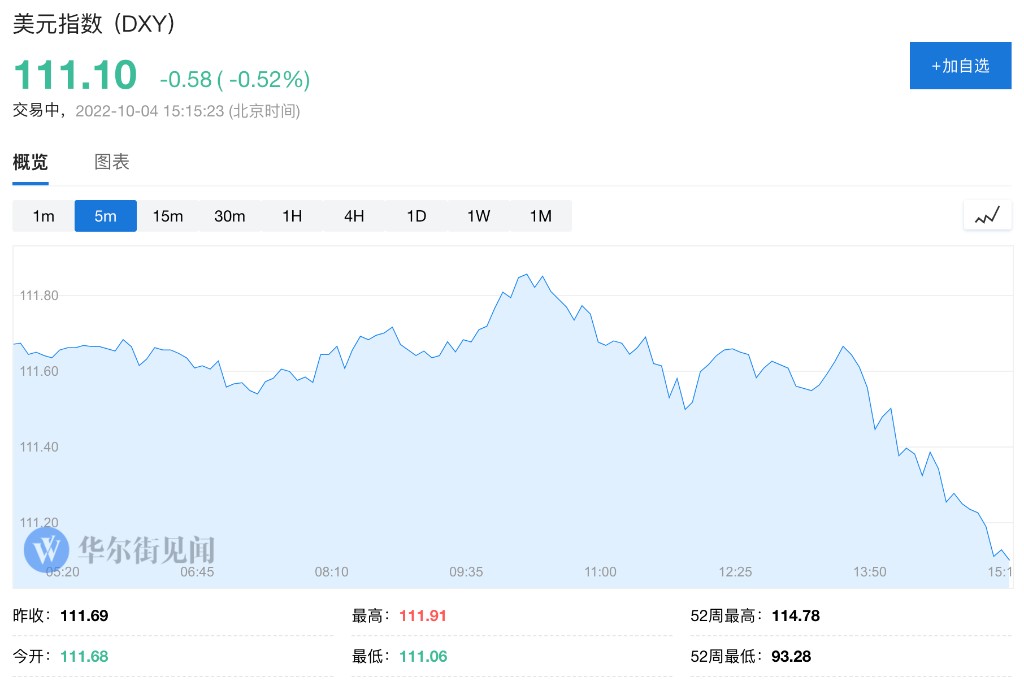 美元指數跌破 111 關口,創 9 月 22 日來新低,日內跌約 0.6%。