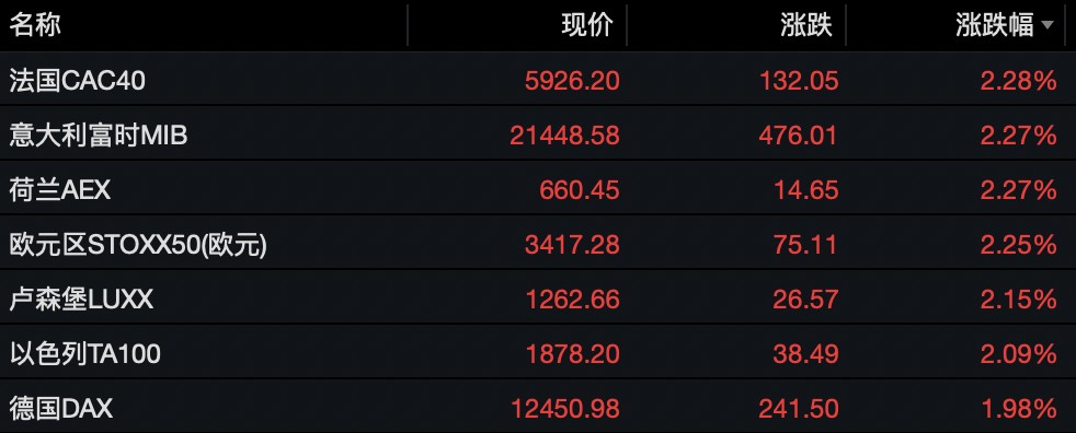截至發稿,歐洲斯托克 50 指數漲 2%,法國 CAC40 指數漲 2%,德國 DAX 指數漲 1.9%。
