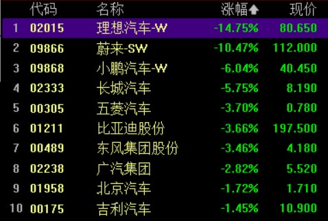 理想汽車今日收跌近 15%,隔夜理想汽車美股收跌超 12%。蔚來跌超 10%,小鵬汽車跌超 6%,長城汽車跌超 5%,五菱汽車、比亞迪股份、東風集團跌超 3%,北京汽車、吉利汽車得超 1%。