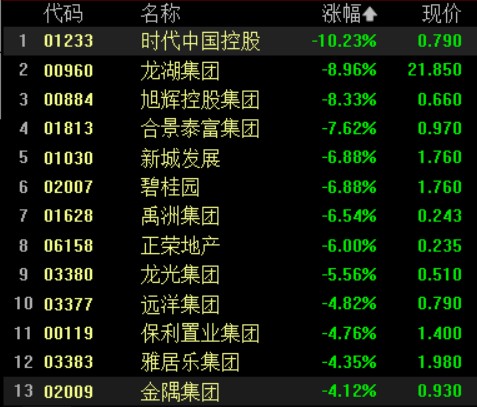 旭輝控股連續第三天下跌,今日收跌超 8%,盤中股價一度重挫 15% 並創紀錄新低。時代中國跌超 10%,龍湖集團跌近 9%,碧桂園跌近 7%。
