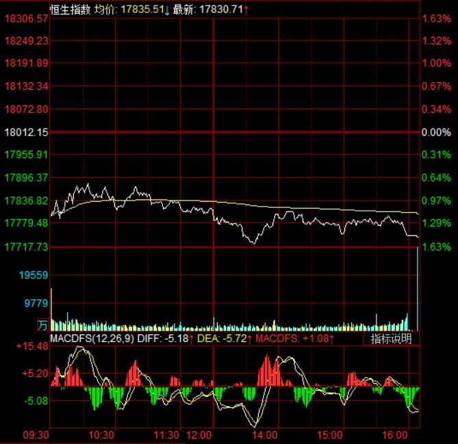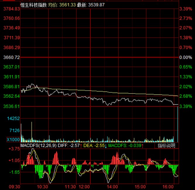 午後,恒指跌幅擴大至超 1%,恒生科技指數跌至 3%。截至收盤,恒指收跌 1.51%,報 17740.05 點;恒生科技指數收跌 3.3%,報 3539.87 點。