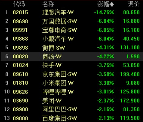 萬國數據跌近 7%,商湯跌超 4%,快手、小米、京東、嗶哩嗶哩跌超 3%,騰訊、百度、阿里、美團跌超 2%。