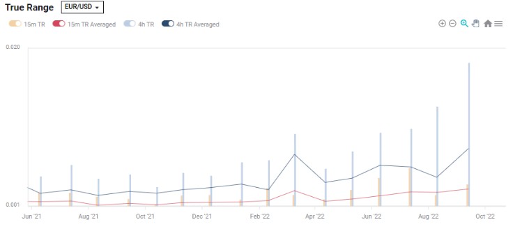 而歐元/美元自 2021 年以來的變化區間對比圖也揭示了通脹對市場的影響。