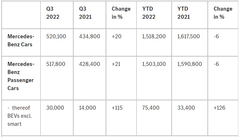 梅赛德斯 - 奔驰官方数据显示,公司汽车今年三季度交付量同比增长 21% 至 51.78 万辆;电动车销量同比增长 115%至 3 万辆。顶级豪华车销量为 7.7 万辆,同比下降 1%,环比增长 8%;核心豪华车销量增长 36%,达到 27.7 万辆。