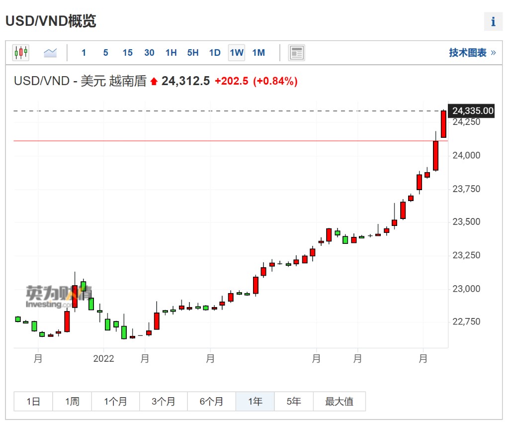 今年以來,為穩定本幣,越南央行已多次拋售美元,並在上月宣佈大幅加息 100 基點。越南盾兑美元匯率今年迄今仍累跌近 7%。