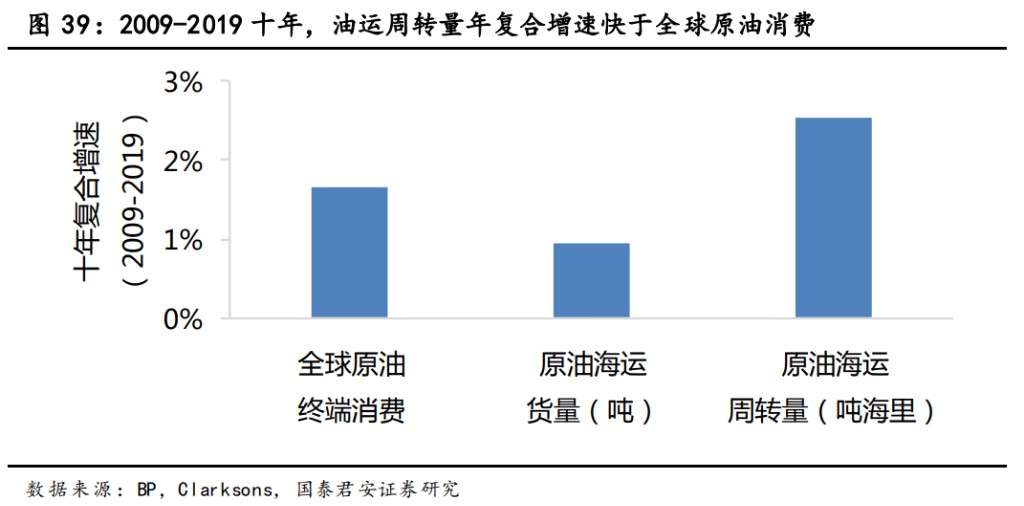 過去十年,油運週轉量(噸海里,反映海運需求)的年複合增速超過 2.5%,高於油運貨量的 1%,以及全球原油消費的 1.7%。原因在於,發展中國家崛起,以及美國頁岩革命,推動全球油運貿易呈現 “需求東移、供給西移” 的結構性變化,導致油運平均航距持續拉長。