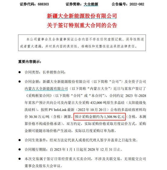 與此同時,大全能源提示相關風險表示,因本合同為長單合同,在本合同履行期間存在因外部宏觀環境發生重大變化、國家有關政策變化、客户需求變化以及其他不可抗力等因素,可能會影響本合同最終執行情況。此外,存在公司因逾期交貨、逾期退換貨、交貨量不足、產品質量缺陷等原因導致公司承擔違約責任的風險。